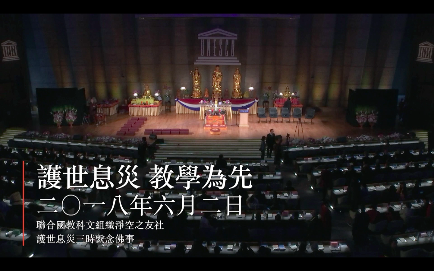 今天是聯合國教科文組織淨空之友社,首次在教科文組織總部舉辦「護世息災三時繫念佛事」的日子。非常感謝大家共襄盛舉!舉辦這場佛事的目的,在於祈求世界永無戰爭,社會和諧;一切眾生都蒙眾神福佑;一切亡者都蒙眾神保佑,同生天國。